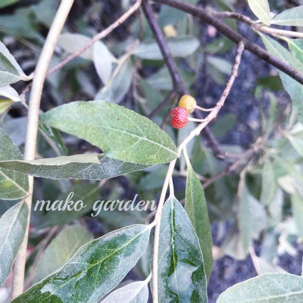 春にはとても甘くて優しい香りの黄色い小花をつけ、夏から秋はシルバーリーフがしなやかに伸び、秋には真っ赤な実を沢山付けます♡ 我が家ではジャムにします。