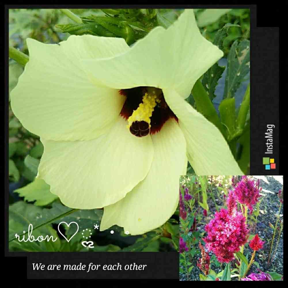 畑のオクラとケイトウのお花♡が綺麗に咲いています💞