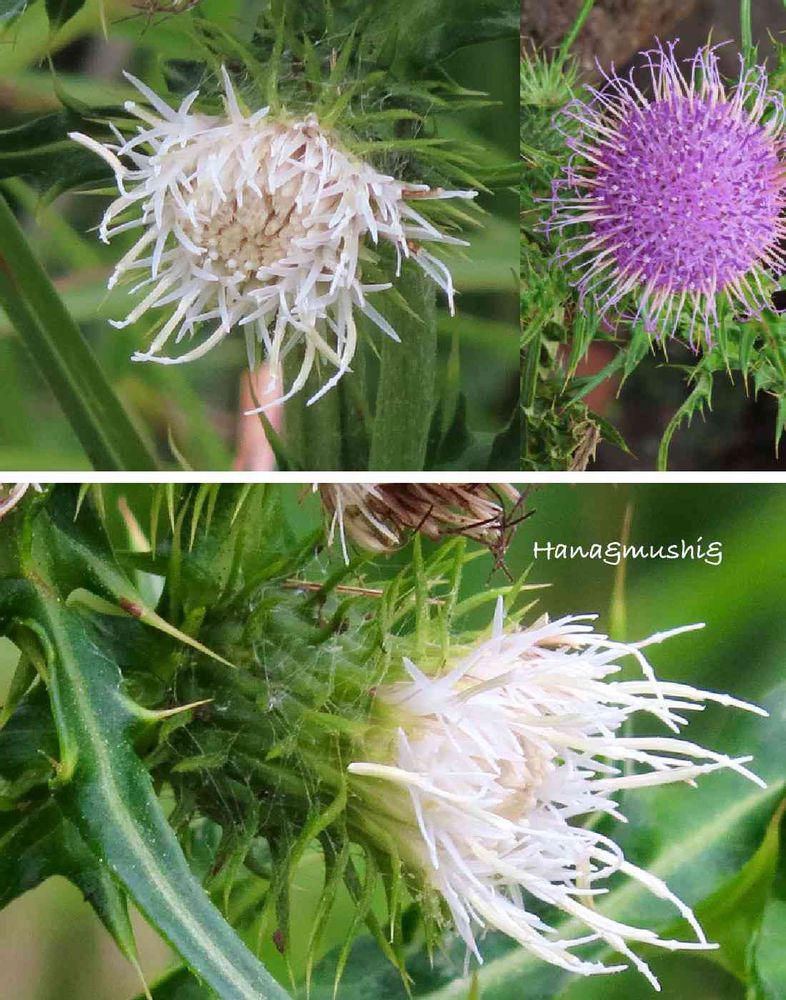 自生の野アザミはほとんどが淡紫色だが、突然変異で色が変わるらしい。淡紫色が突然変化して白色や淡紅色になるということである。それを株分けして栽培すれば、その色がそのまま残る。園芸品ではドイツアザミと呼ばれ、花の色に紫、紅、淡紅、白などがあるが、多様な色があるのは突然変異の株を育てたもののようである。