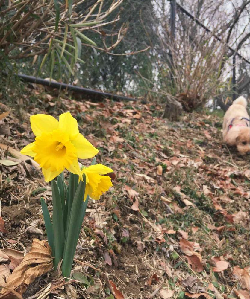 ラッパ水仙⁉︎綺麗な黄色で咲いてるね〜ちらっとワンコ見えた〜\(ˆoˆ)/♡︎ʾʾ