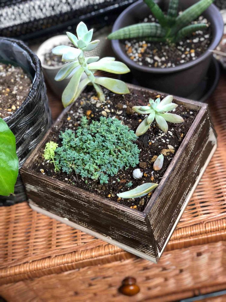 木箱を手に入れたので多肉の箱庭を作ってみました。成長して一面セダムになったら可愛いだろうなと期待してます!