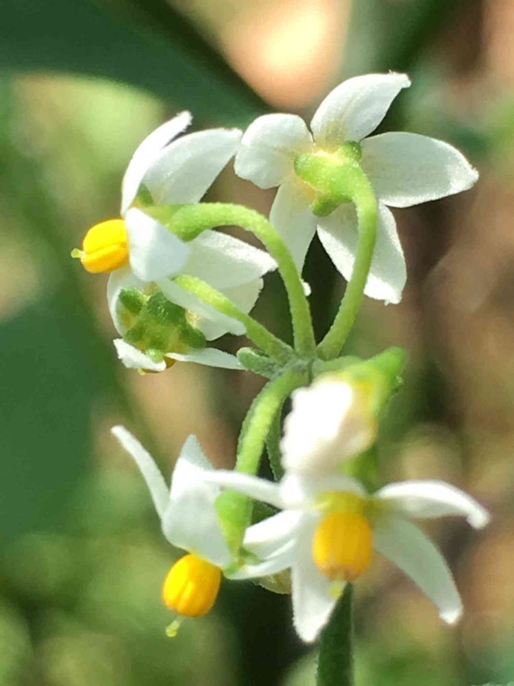 クレマチスの鉢に、どこからかやって来て…オシロイバナかしら?しかし‼️全く別の小さな白い花が❣️近づけは可憐ですね😉もうしばらく放置😊