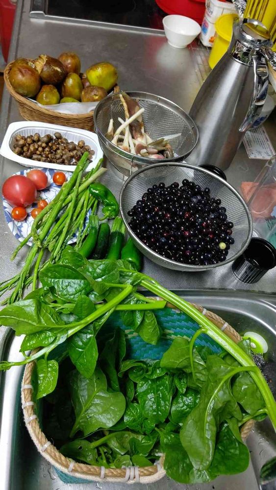 ツルムラサキ、ブルーベリー、トマト、むかご、みょうがアスパラ諸々、いちじく
