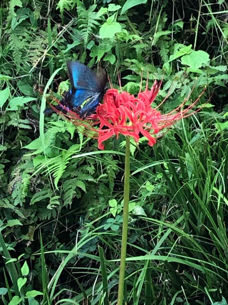 緑をバックに赤いお花と🦋、綺麗です☺️