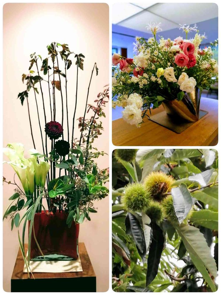 picはレストラン内のアレンジ💐と駐車場の栗の木🌳