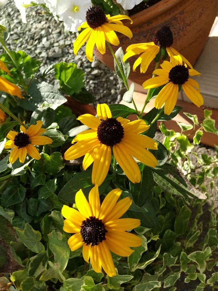 ルドベキア ゴールドストラム✨寄せ植えのメインで頑張ってくれてた❤️ルドベキアさん🍁のこもれびのを浴びながら優しく咲いています(⌒‐⌒)霜が降りる前に花壇へ帰ろうね💕