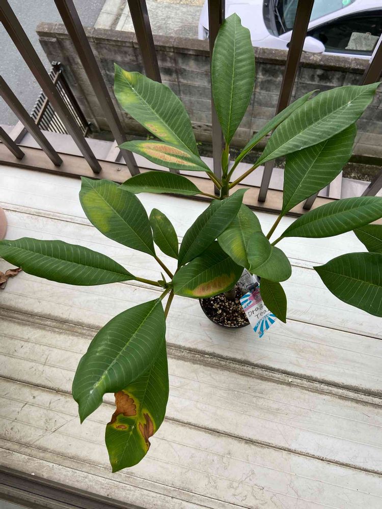 ついこの間新潟のタヒチマルシェーさんから購入したプルメリア「ドラゴンティアーズ」ベランダに置いたら葉焼けしてしまいました😓 今年購入した子も含めて他の子は大丈夫なのに何故この子だけが☹️