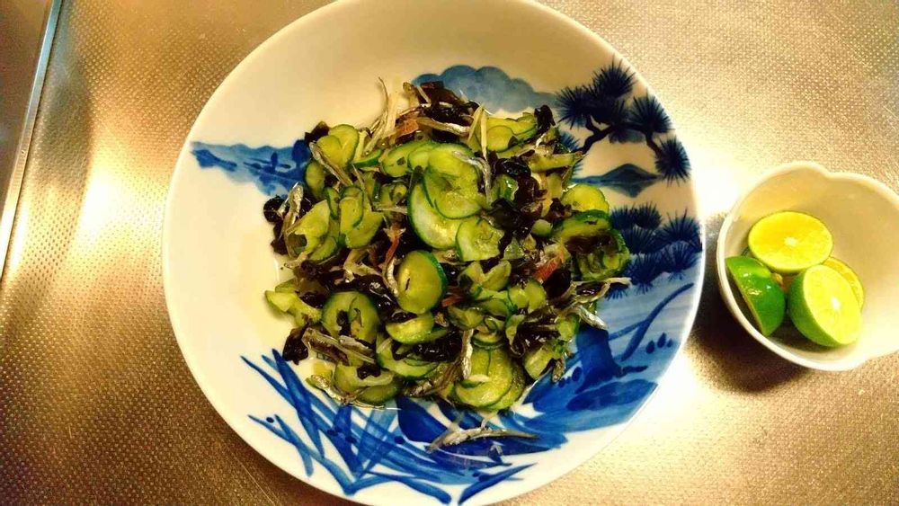今日は、キュウリの酢のものにしました。キュウリ、わかめ、茗荷谷、イリコ、冷凍しておいた青紫蘇をたっぷりのスダチを絞って甘酢漬けにしました。