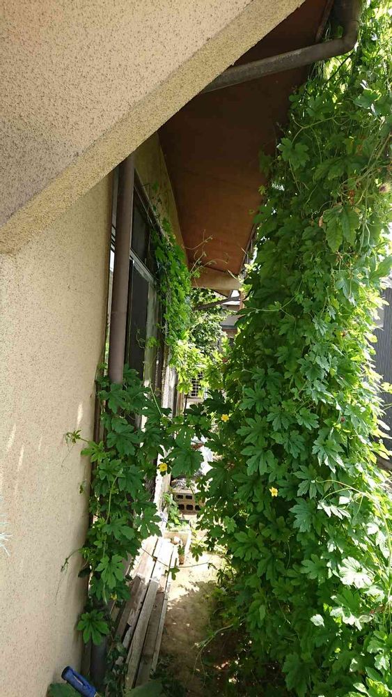 只今、ゴーヤはこんな感じです。カーテンはカーテンでも遮光カーテンなみ😅高いところは脚立で収穫😽