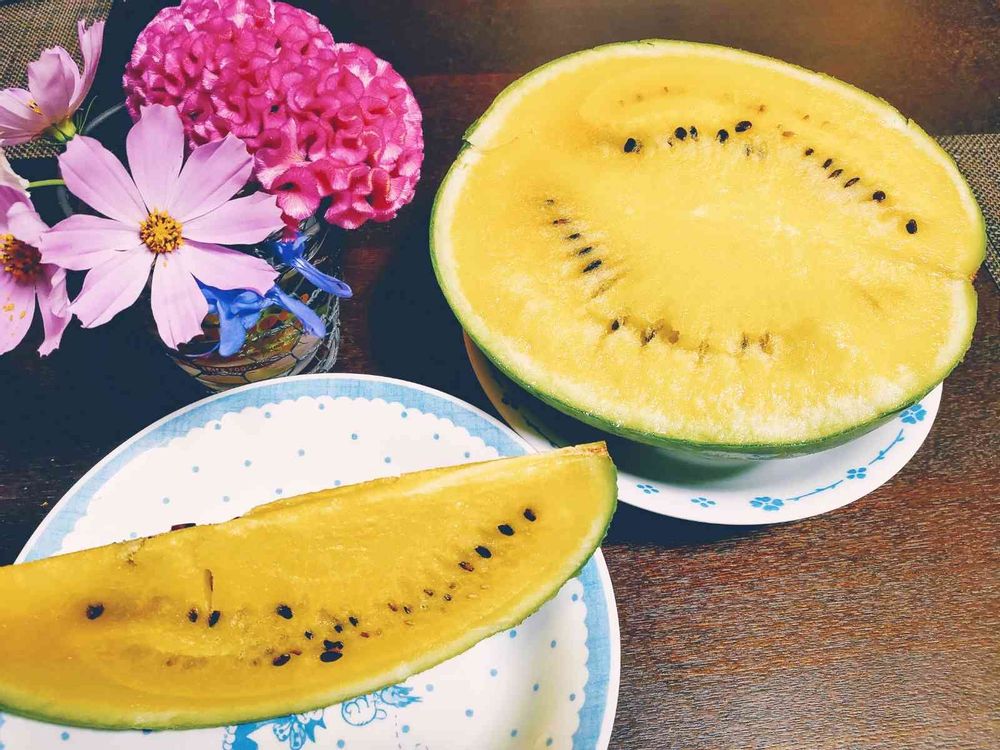 黄色いスイカの苗を植えてた事をスッカリ忘れていたので、今日収穫したスイカを割ったらビックリしたぁ😲