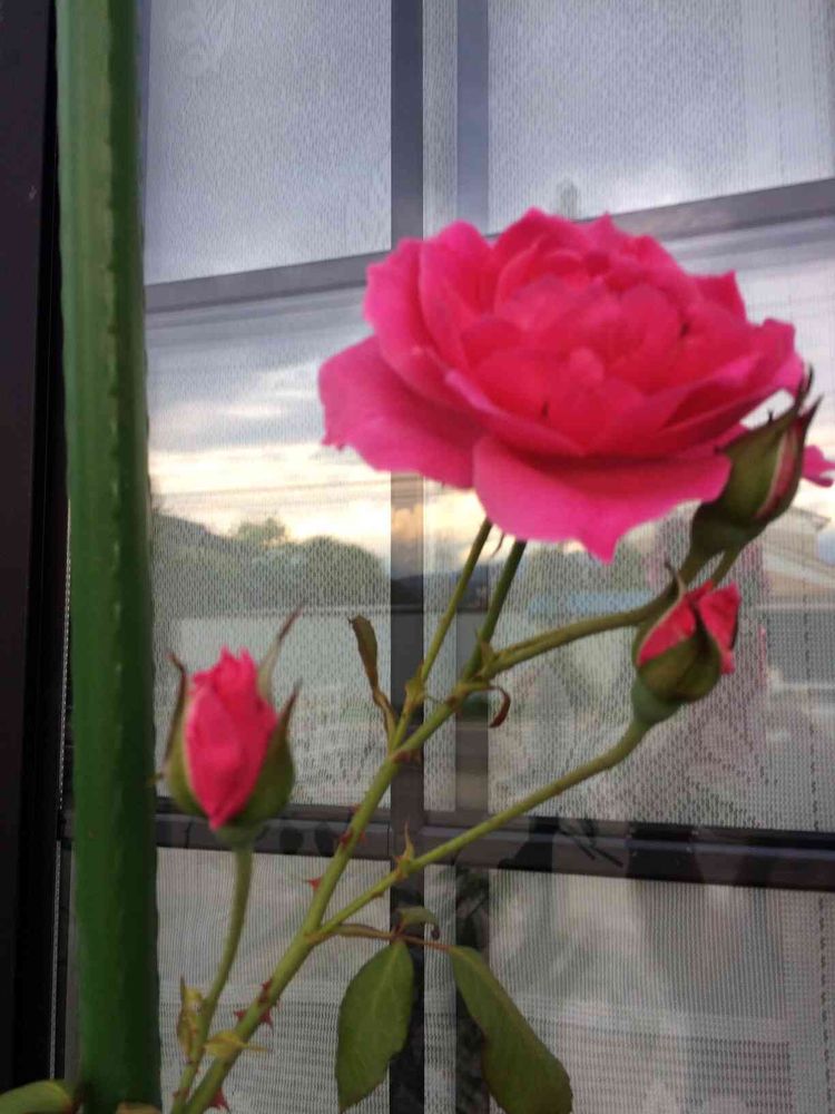 こんばんは〜〜🎵🎶地植え組の薔薇ちゃん🌹🌹大好きだなぁ。名前ははっきりわからない💦窓ガラスに映ってるのは立山連峰かな?私も映ってる?失敗💦💦💦💦