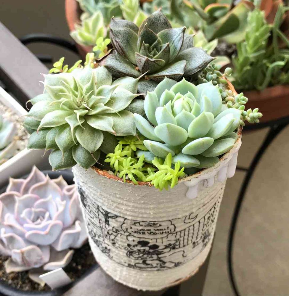 可愛いリメ缶にゆったり寄せ植えしちゃいました☺︎