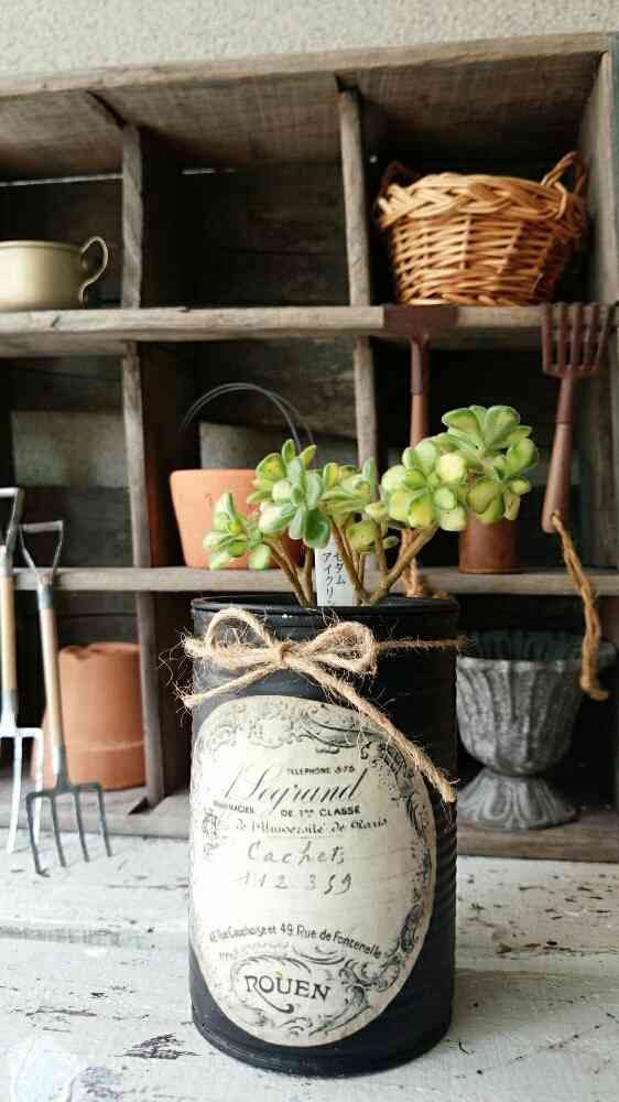 アイクリソン錦だっけ?アンティークラベルを使ったリメ缶に入れて。