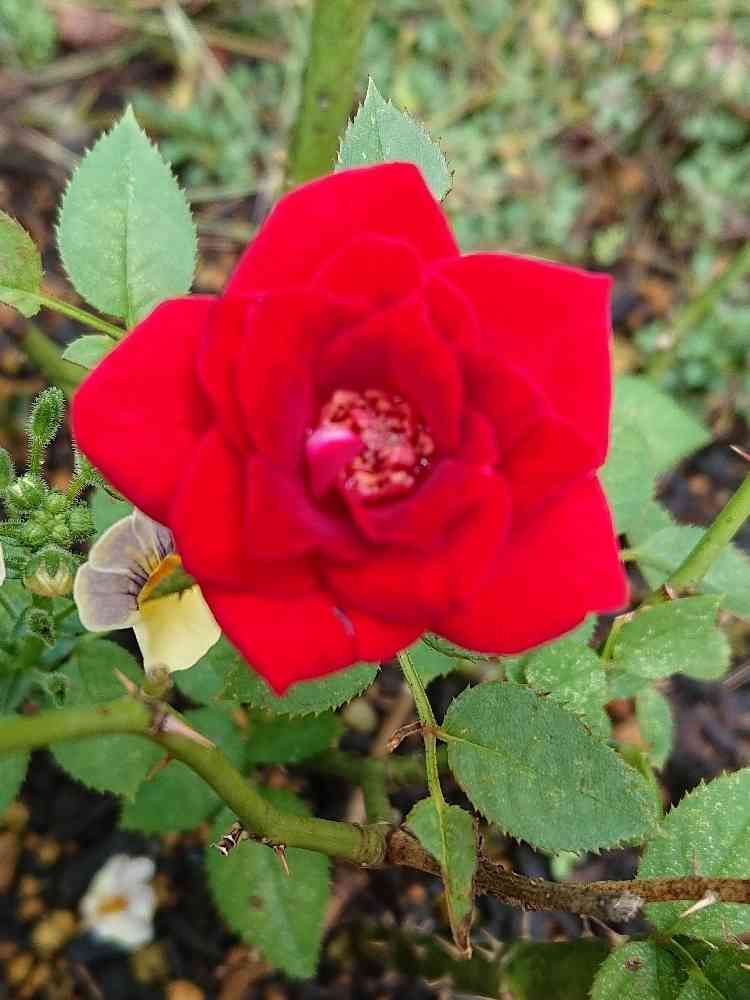 今日のお花は真っ赤なミニ薔薇です🌹🌿😊春はもっと花びらが多かったけれど今は少ないです🌹🌿😊でも可愛いです🌹🌿😊