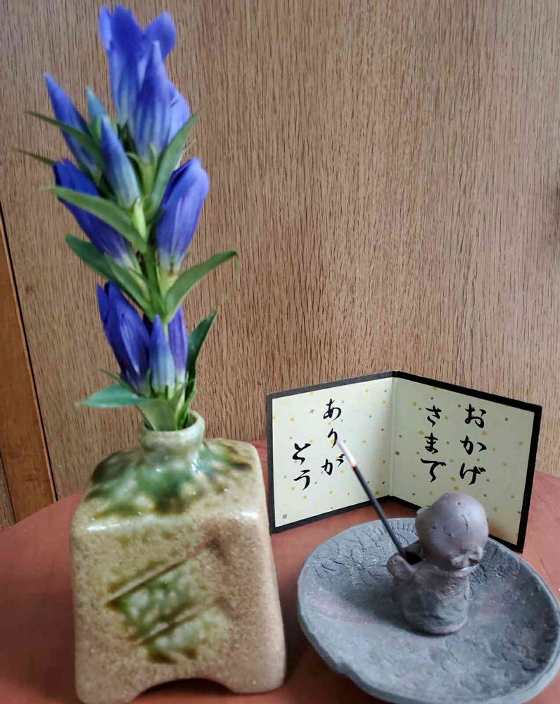 お仏壇のお花買ったらりんどうが長くてカットして一輪挿しに挿したの💙💜