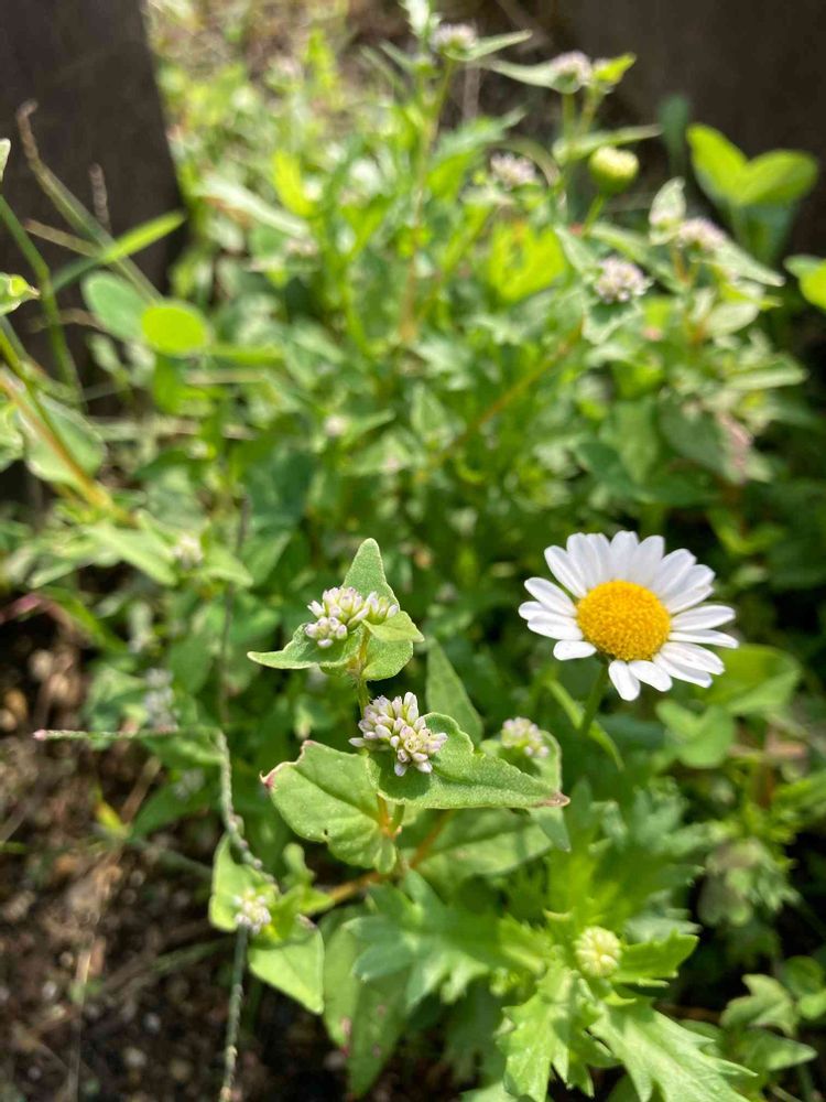 ノースポールとミゾソバの蕾だと思いまが、仲良く並んでます😊