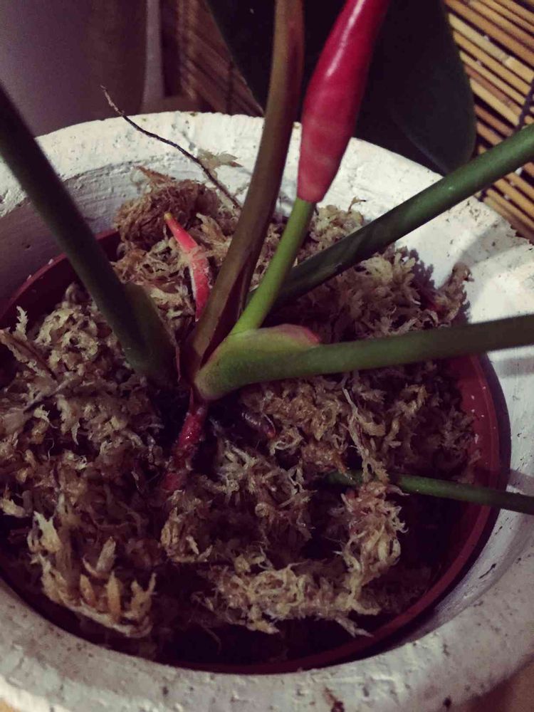 値下げコーナーで買ったアンスリウム 植え替えたら 花芽出てきた後 赤い根っこ出てきた😳