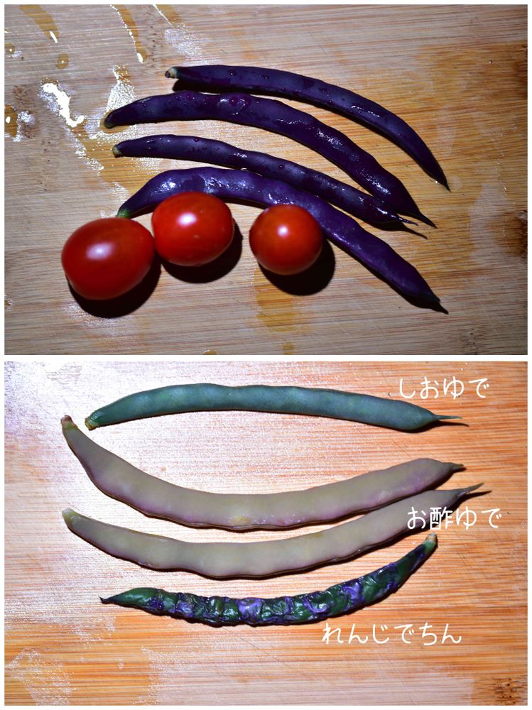 ムラサキインゲン トリオンフォバイオレット。ゆでるときれいな紫から紫と緑の混ざった汚い色になります。 さやいんげんなので、通常は塩ゆででいただきますが、実験で、お酢でゆでた物、レンちんした物を用意しました。アントシアニンは酸性で安定だからです( ー`дー´)キリッ. お酢ゆでは塩ゆでよりも色が抜けました💦 600w 1分のレンチンは、紫と緑のまだらになりました˚‧º·(˚ ˃̣̣̥⌓˂̣̣̥ )‧º·˚ きれいな紫を残せる加熱方法を見つければ、イグノーベル賞はいただきっ🎵