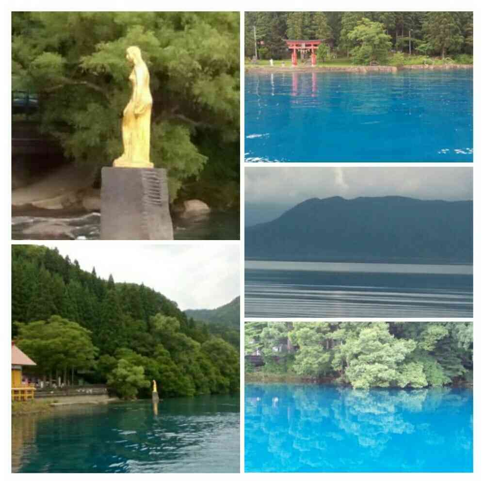 田沢湖、辰子姫今は八郎さんと同居してラブラブだとか、水の色が深い藍色で不思議😆七色木、1本の木から七種類の木が生えてるって😓触ると雷雨が起こるってキャ━━━(艸;Д;il!)━━━ァァ!!!