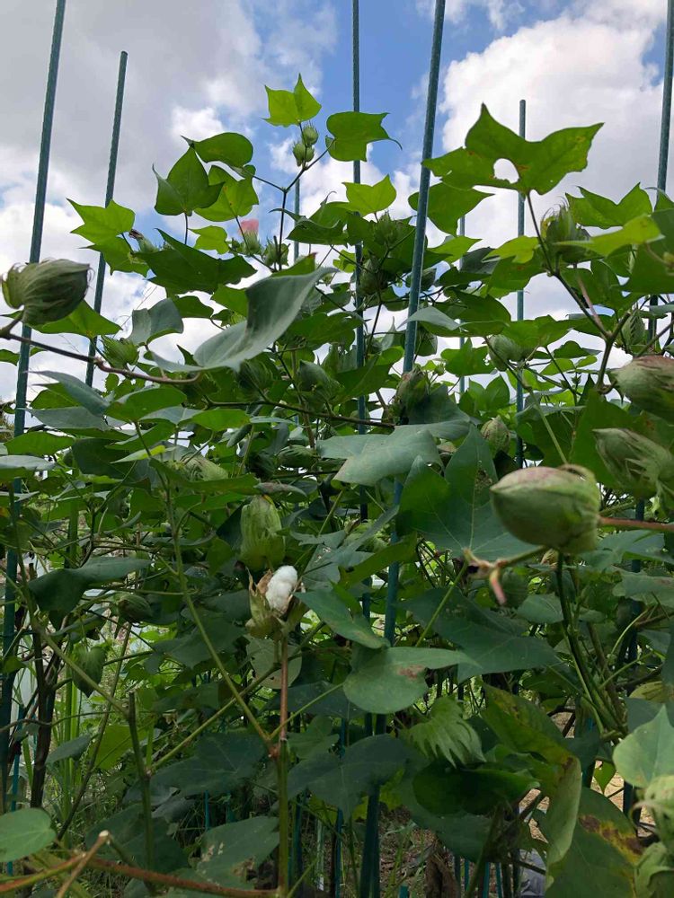 白い花、ピンクの花、緑の固い実、われて白い綿が見えるなど、初めて育てましたが、綿の木は、赤ちゃんから大人まで同居してる感じです(笑)