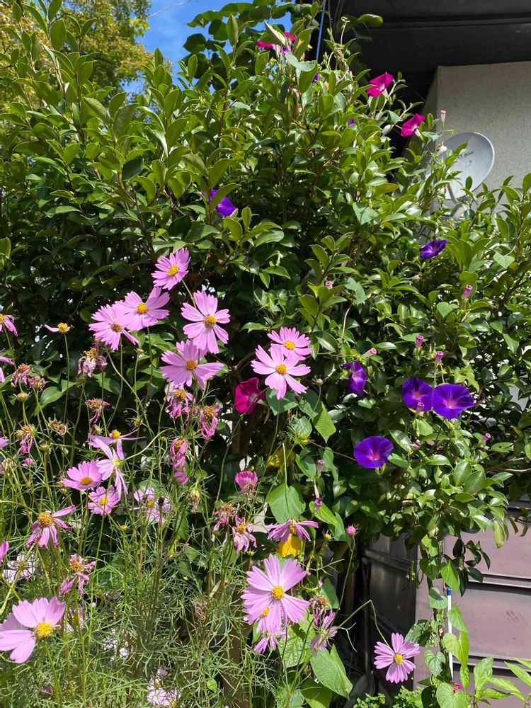 コスモスと朝顔とTSUBAKI(山茶花かもしれないけど~)