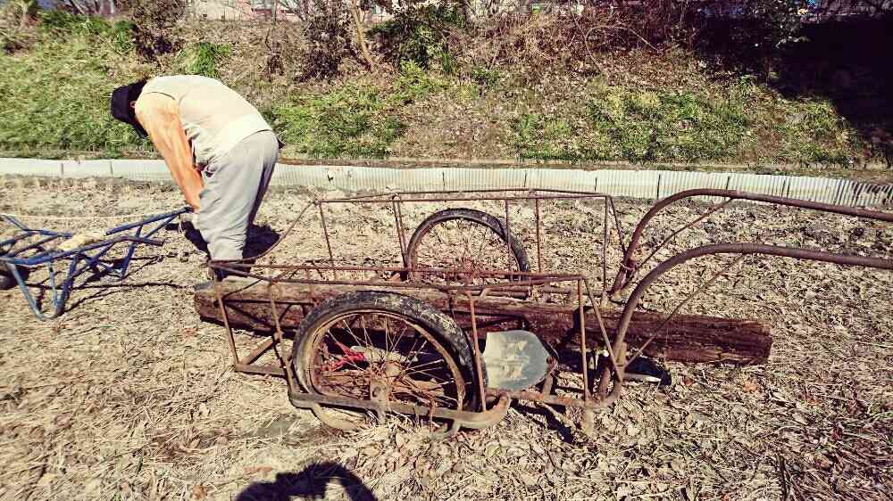 リアカーは放置されてたオンボロで試しに使ってたんだけど、タイヤの辺りの鉄が劣化しててボロボロになっちゃいました(笑)
