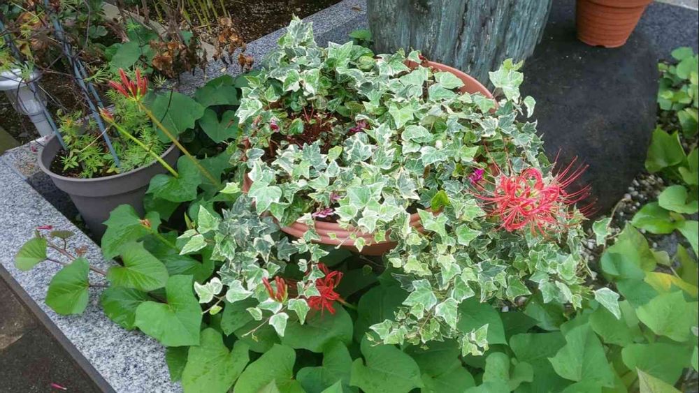 🍠サツマイモの葉とシクラメン&アイビーとのコラボのように見えます♬