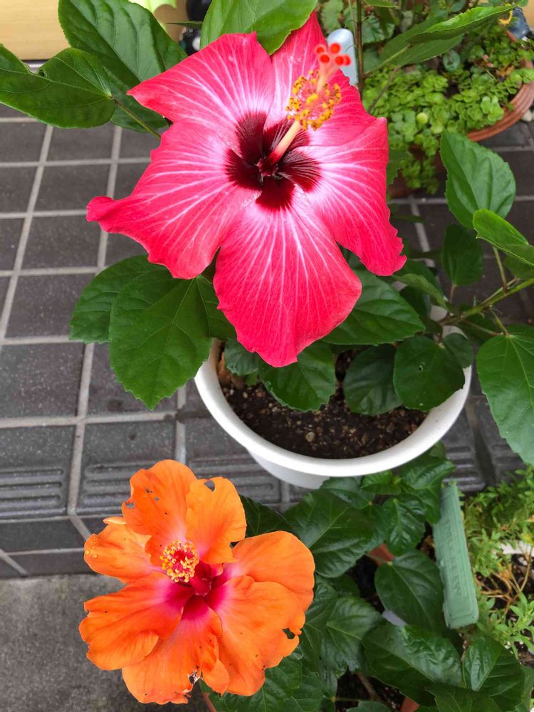 今日も、2色のハイビスカスさんが美を競っております😊🧡🌺あ、もしお時間ありましたら、花びらの枚数を教えてみてくださいな😃🙏🙌😅