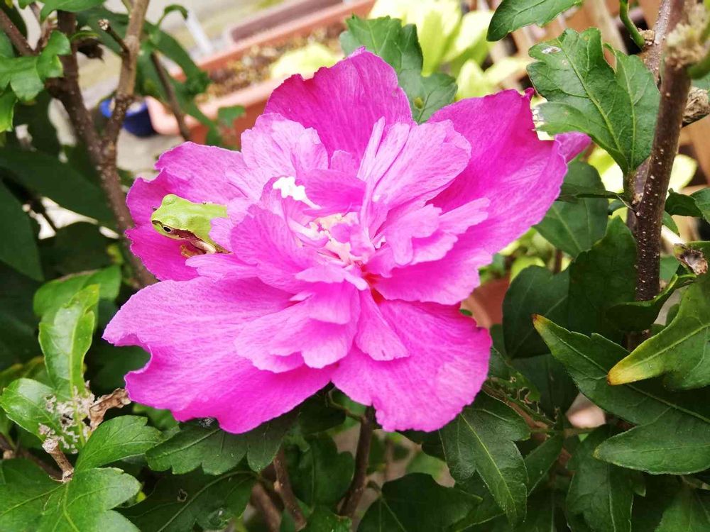 今朝、ムクゲの中に…🐸🌺