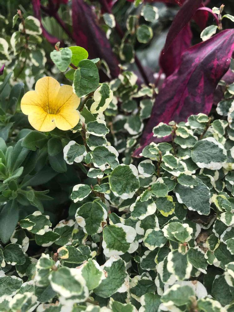プミラさんの綺麗なグリーンと白の葉っぱ🌿、ミリオンベルの可愛い黄色とシックな赤葉センニチコウのパープル💜が素敵~😆💕
