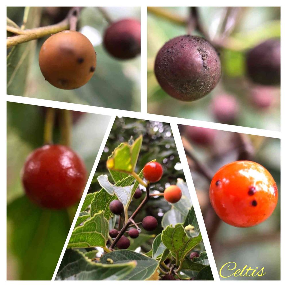 エノキは結構どこにでもあるのに実がつ いてない木も多いです。今朝散歩した公園には榎の大木がニ本 一本は養生中となって囲いがされていて実は殆ど見つけられずもう一本の木は葉も虫食われがなくとても素敵なエノキらしいカラフルな実が沢山ついていました🌀🎶