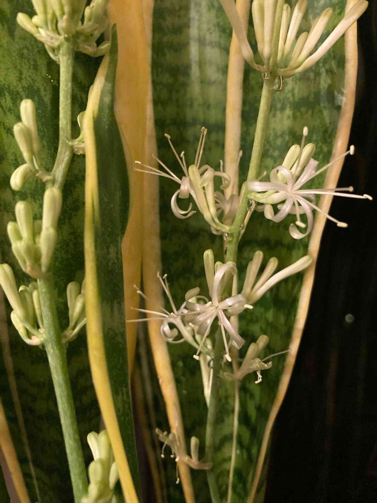 サンスベリアの花、初めて拝見しました〜♫昼間閉じて、夕方から咲くんですねー!びっくり…白い花可愛いですねー
