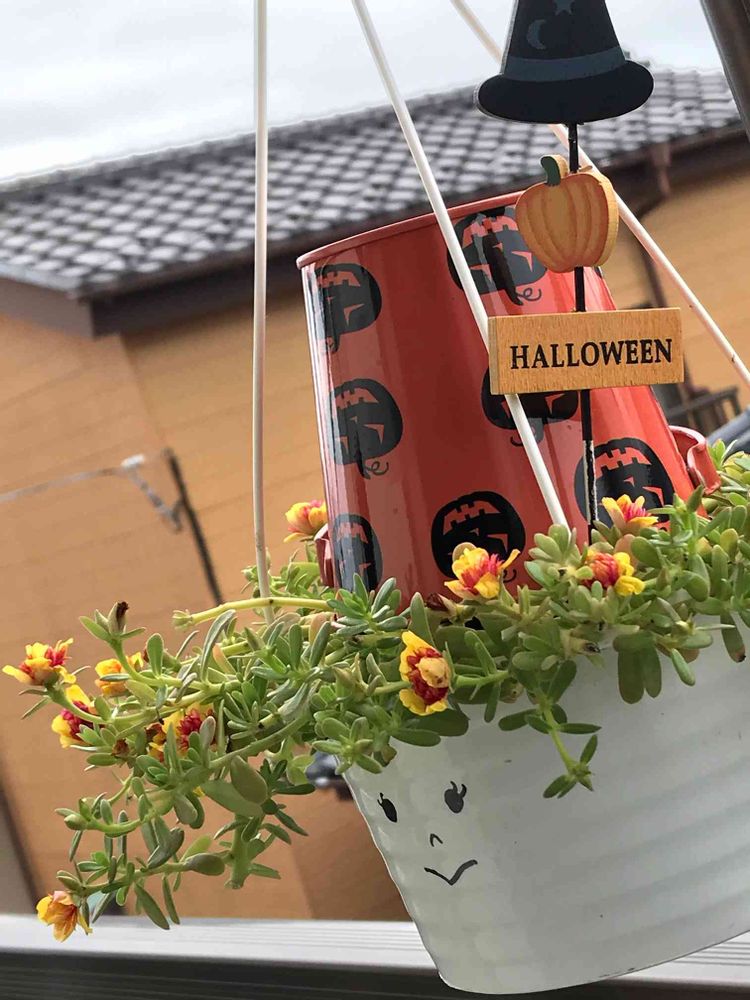 ベランダの物干しに下げてあります。またお花をつけてきたので、ハロウィン仕立てにして、遊んでみました🎃👻
