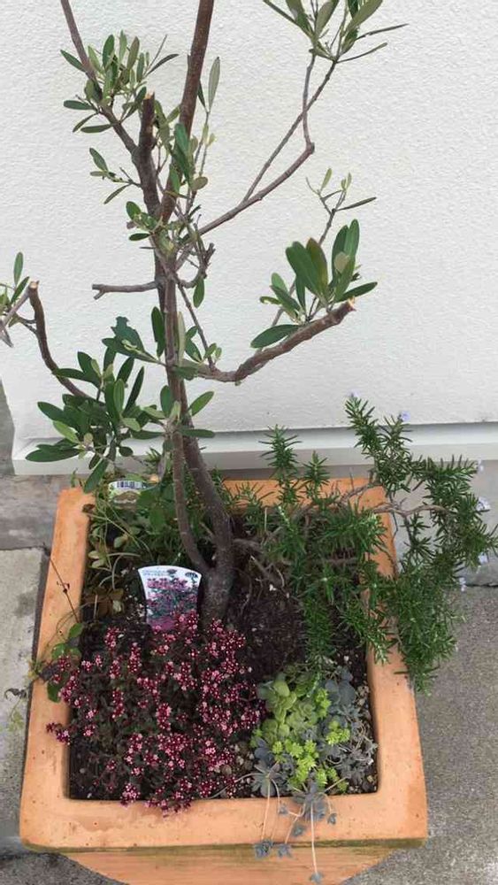 オリーブは、黒ポットに入れられたままローズマリーと寄せ植えされていて、根詰まりを起こしてました!