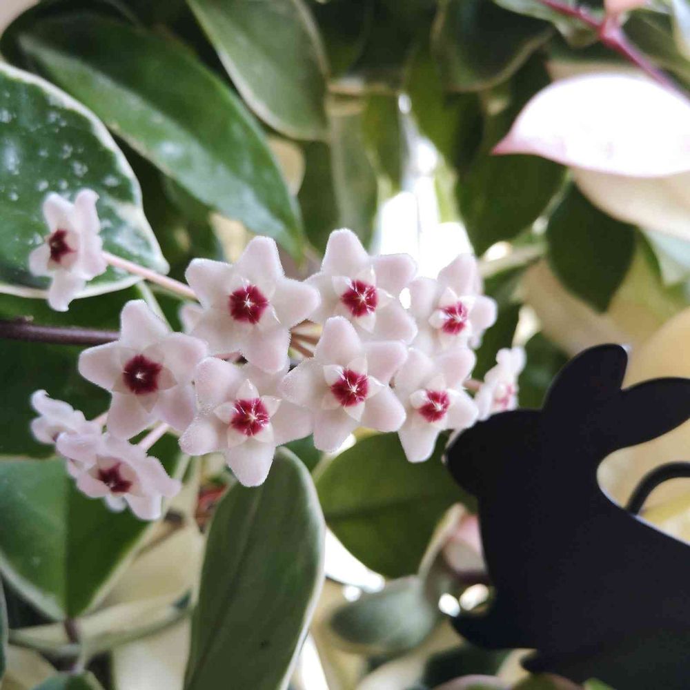 4、5年前からリース状に仕立ててあるホヤ(サクララン)を育てていましたがなかなかバナナが付かず、悩みながら育てていましたがやっと今月咲いてくれました。実物を見るのは初めてです。樹脂粘土で出来ているかのような不思議なお花は可愛らしくてとても綺麗です。