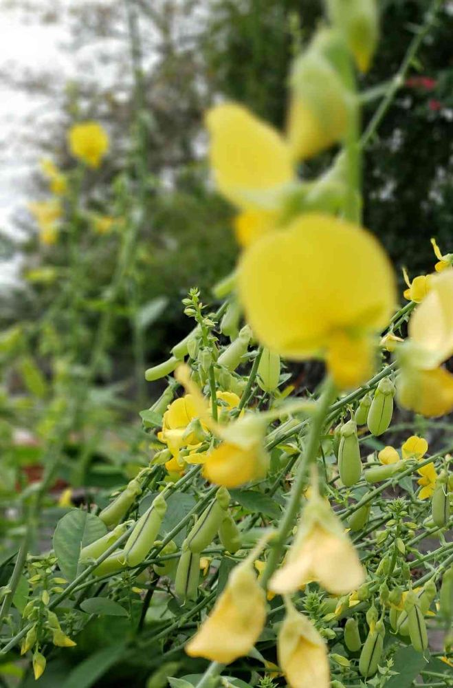 花が咲き終わるとマメ科特有のこのようなさやができ始めますが、これがタヌキのしっぽを想像させる太さ(笑)それが熟してくると茶色くなり、さやの中で種が外れて、からからマラカスのような音がするようになるんだって~😃🎵