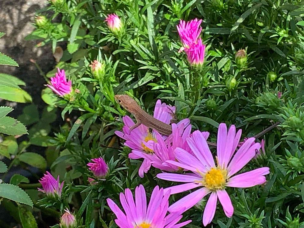 アスター の蕾の中で、カナヘビの赤ちゃんが日光浴中!可愛い❤️❤️