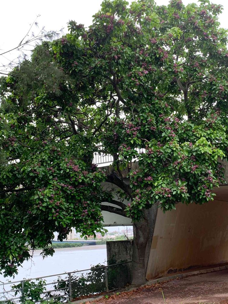 クロヨナの木の全アップです〜湖畔迄枝が垂れ下がっています🌲🌿🌸