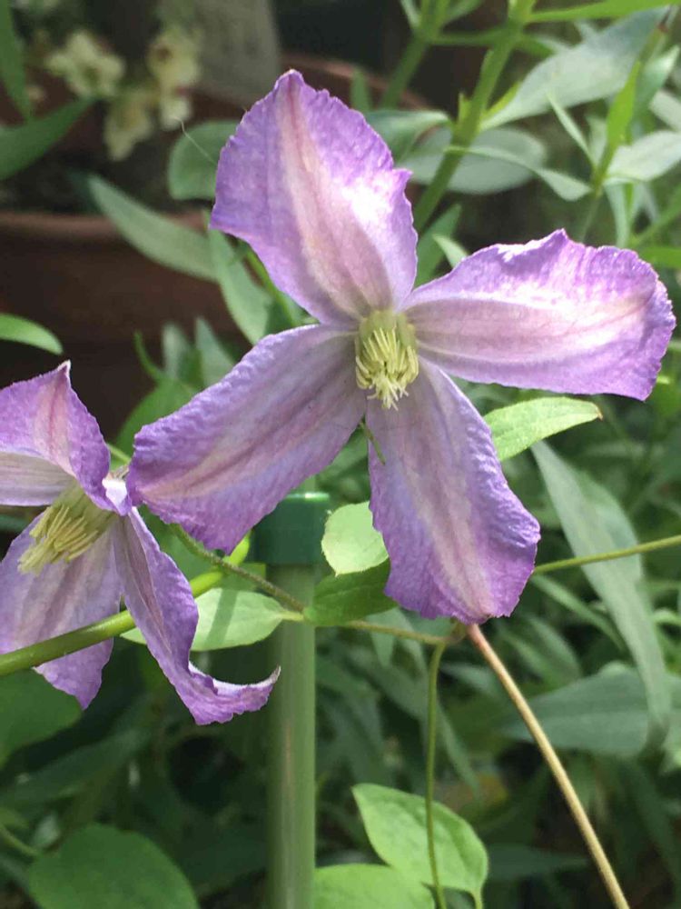 クレマチス プリンスチャールズ 初めて2輪咲きました。でも、花びらが4枚しかないし、まだまだ未熟って事かな?でも、嬉しい💕