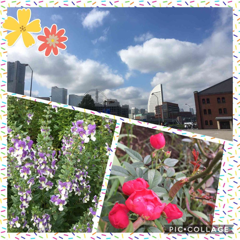 晴れたので横浜山下公園から海沿いに散歩に行きました。公園の花壇にアンゲロニアやガウラ、ペンタス、赤いバラ🌹などがきれいに咲いていました。秋らしい空で、気持ち良かったです。^o^。