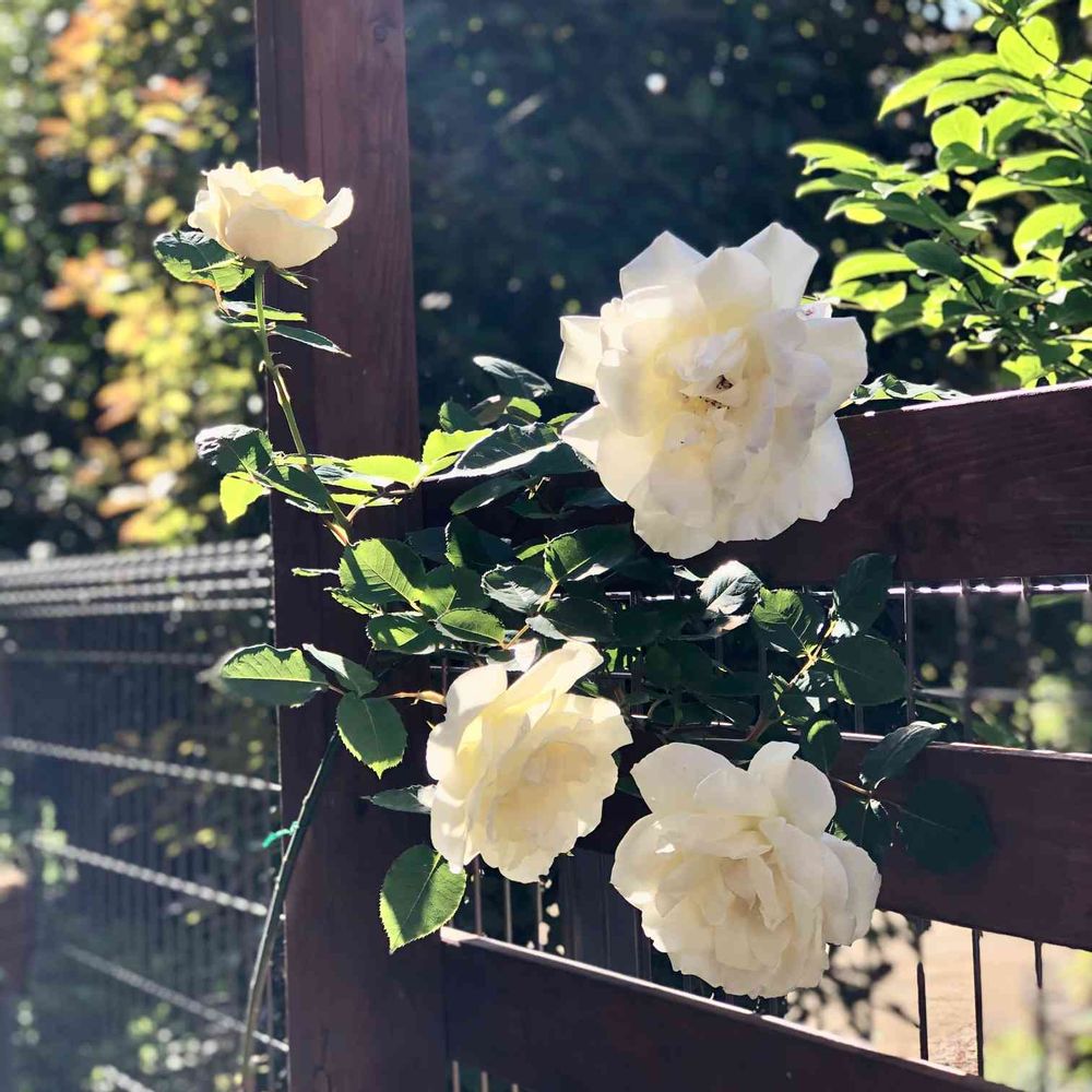 5月の庭の様子です。つるホワイトクリスマス、花のサイズは大きく、咲き始めはとても良い香りがします。