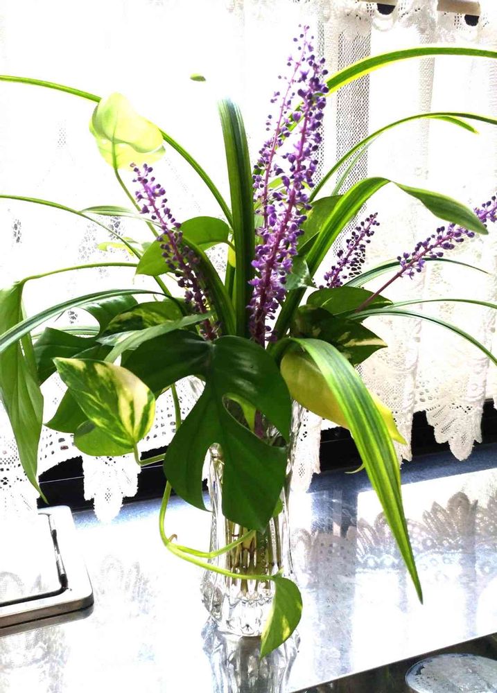 部屋の観葉植物にお庭のヤブランを入れてみました🌿💜
