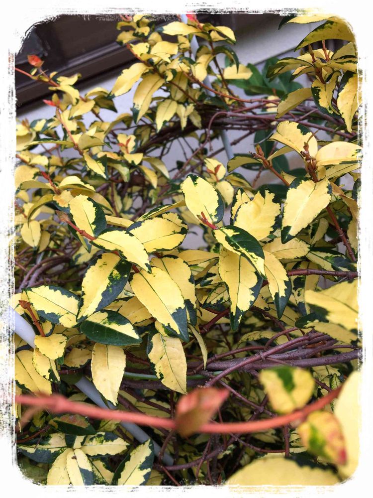 濃い緑に黄色い斑が幅広く入り、新芽がオレンジ色ではっきりとしたトリカラーがとっても綺麗✨