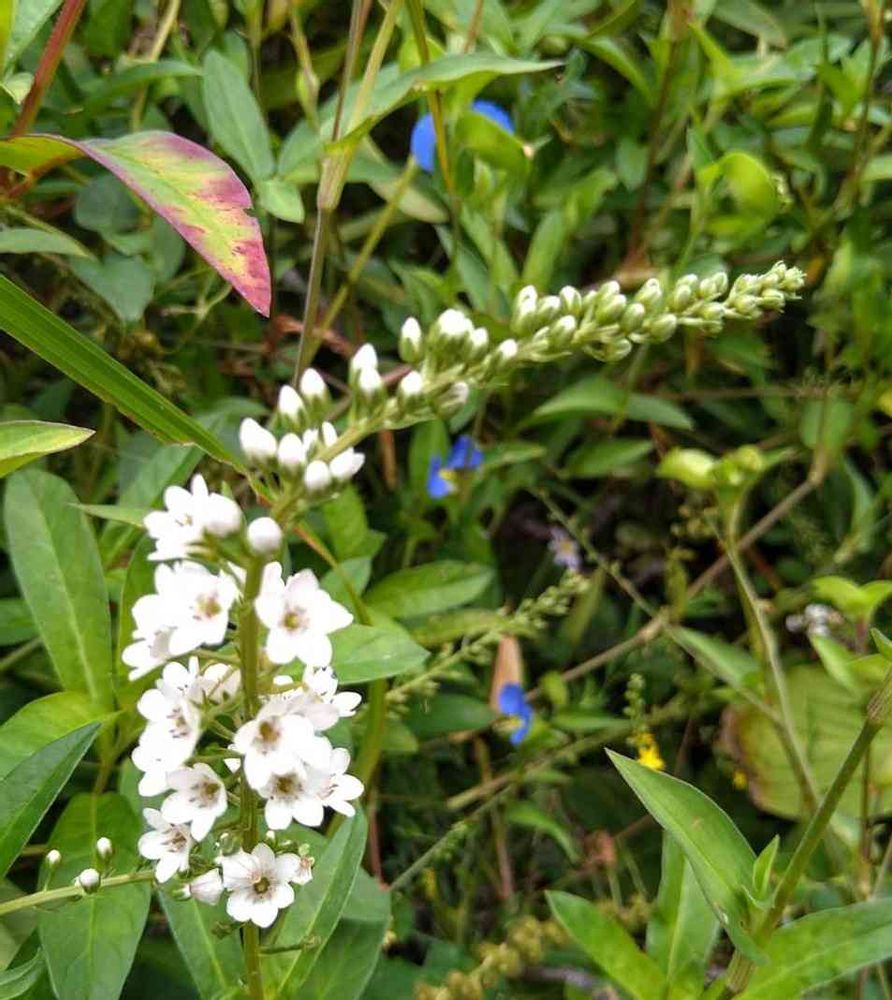 目黒自然教育園の白いトラノオの花がまだ咲いていました、側に青いツユクサ、黄色いキンミズヒキが咲いています💕