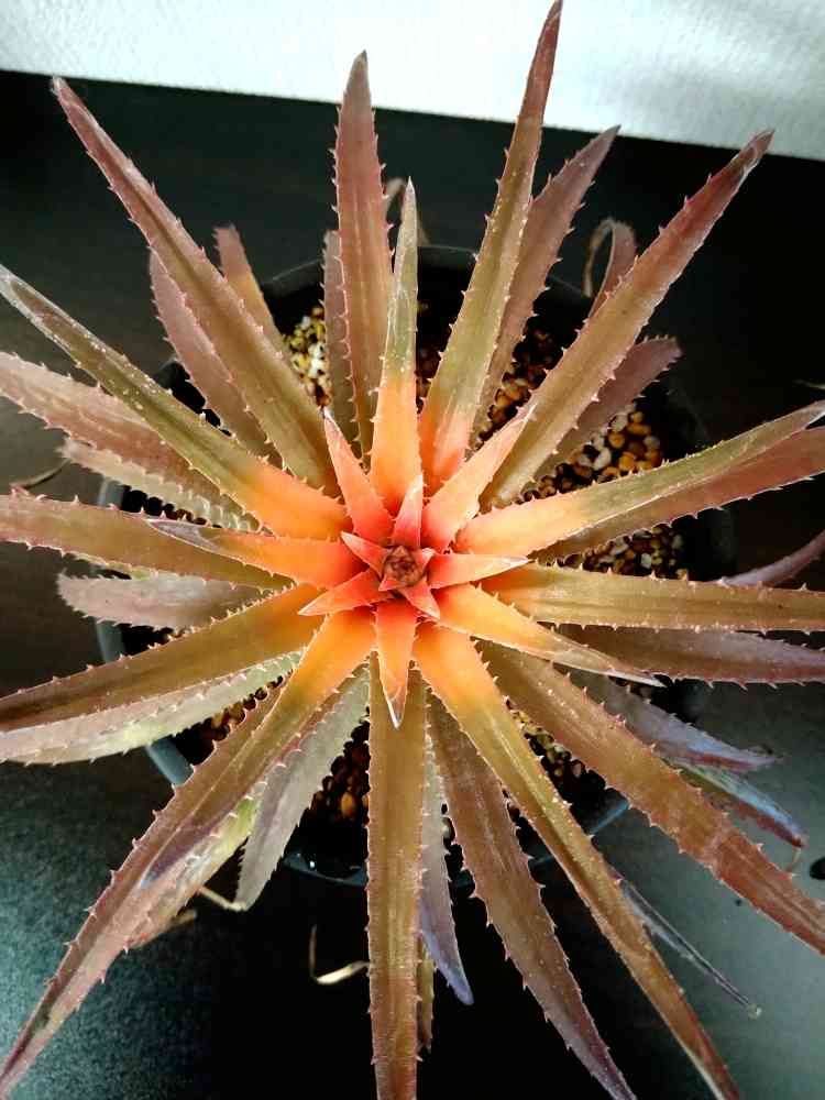 こちらはシンコラエラという種類の植物です🎶普段は触ると、ただ痛いだけの草(葉自体がノコギリのように棘だらけ)ですが、最近中心部分が、オレンジ〜ほのかに赤く染まってきました❣️初めての現象にドキドキ😆