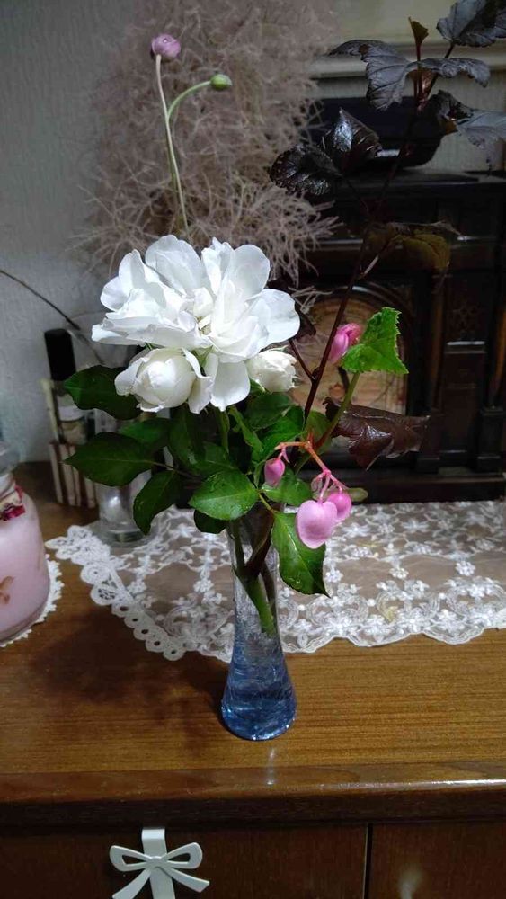 白いバラにシュウカイドウのピンクがお似合いです。