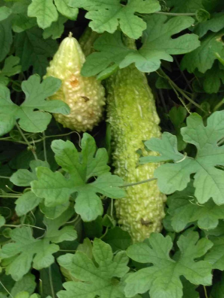 出勤の途中で、花壇にゴーヤが丸いのと長いのが、並んでいました。