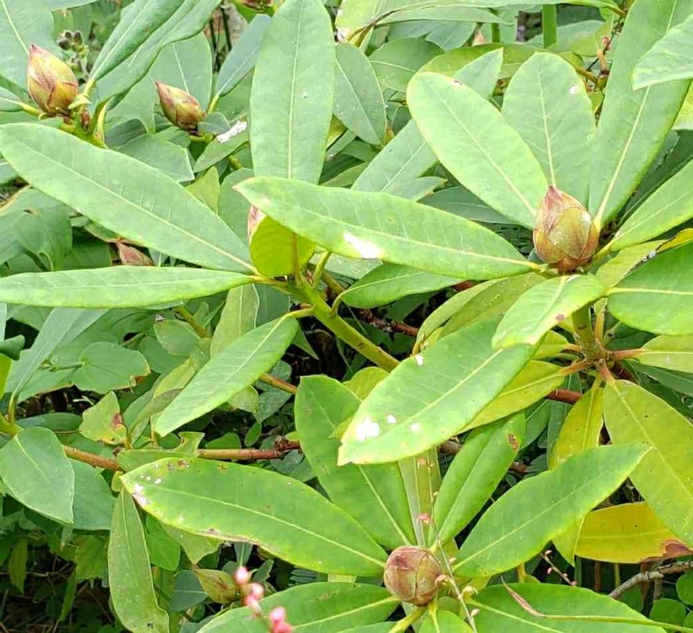 シャクナゲはもう来年の花芽を付けてます。花芽はふっくら大きく、葉芽は細くとがっていて、今はまだ小さく目立ちません。今見える芽は花芽なので取ったらだめですよ。