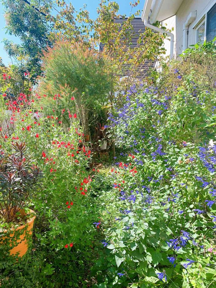 青い花が可愛いですが水遣りしかやってなかったので通れなくなりました💦