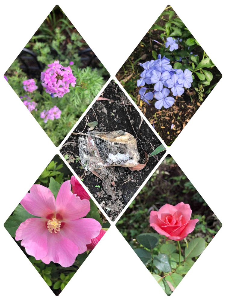 ルリマツリ、バラ、アメリカフヨウ、バーベナ、葉脈だけになった落ち葉